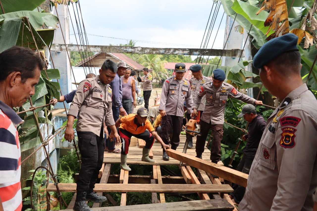 Peduli Masyarakat, Polres Merangin Bersama Batalyon B Pelopor Sat Brimobda Jambi dan Polsek Pamenang Bersama Pemerintah Desa Karang Berahi Perbaiki Jembatan Gantung