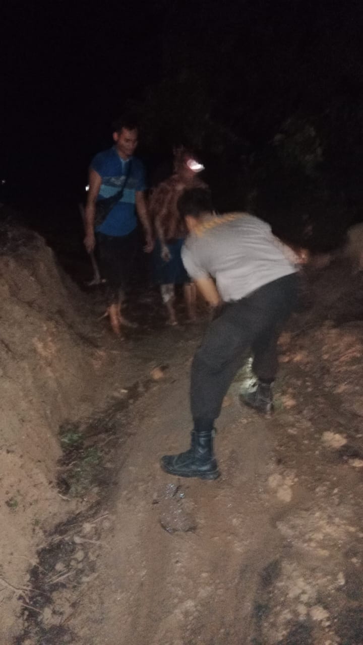 Merangin – Personel Polsek Muara Siau bersama warga bahu-membahu membersihkan material longsor yang terjadi di ruas jalan lintas Muara Siau – Jangkat antara Desa Sekancing berbatasan dengan Desa Pulau Raman.
