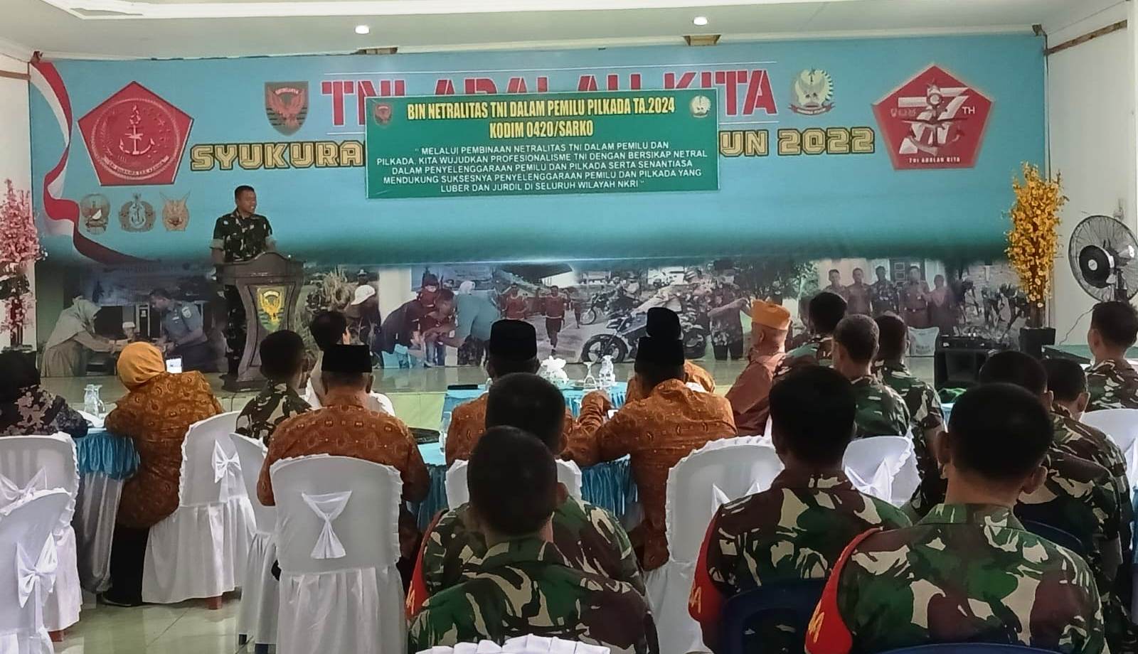 Merangin – Komandan Kodim 0420/Sarko, Letkol Inf Suyono S.Sos, berikan pengarahan kepada Anggota Kodim 0420/Sarko dan Veteran Purn , terkait netralitas TNI pada pelaksanaan pemilu 2024, yang berlangsung di Aula Makodim 0420/Sarko Kabupaten Merangin, Selasa (06/02/2024).