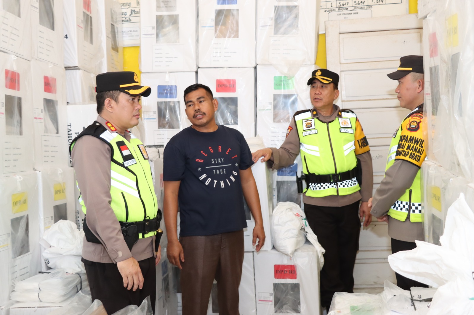 MERANGIN – Kapolres Merangin AKBP Ruri Roberto bersama PJU Polres Merangin melaksanakan pengecekan gudang logistik Pemilu 2024 yang telah di distribusikan dari gudang logistik KPU Kabupaten Merangin ke gudang logistik PPK.