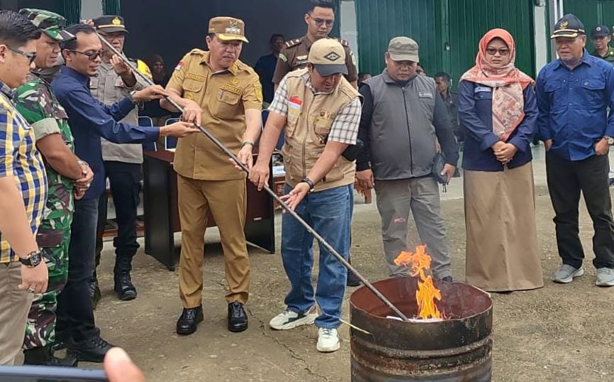Bangko-Pj Bupati Merangin H Mukti secara simbolis memusnahkan surat suara kelebihan dan surat suara kategori rusak pada Pemilihan umum (Pemilu) 2024, di depan Gudang KPU Merangin kawasan Waskita Karya, Selasa (13/2),