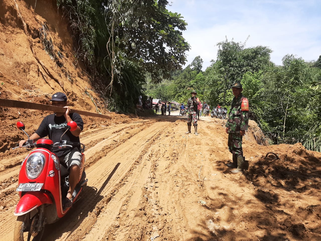 Babinsa Serka Suwarno dan para Babinsa lainnya, mengatakan, bencana tanah longsor yang menutup Jalan Desa Tanjung Mudo terjadi saat hujan turun dengan intensitas cukup tinggi yang memicu longsor, akibatnya material tanah menutup jalan