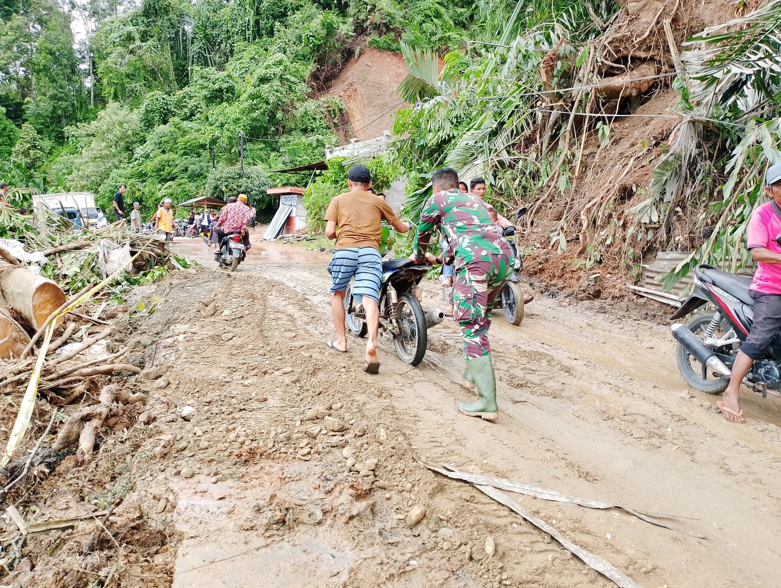 Dalam hal ini, Babinsa terus bergerak ke lokasi bencana Longsor, selalu berupaya untuk membantu kesulitan rakyat di sekelilingnya, Dari saat terjadinya Banjir sampai pasca longsor. Seperti pada hari ini para Babinsa Sungai Manau, Serda Sofran Ihsan, membantu membersihkan jalan, membantu pengendara yang melewati jalan yang di penuhi tanah longsoran agar masyarakat bisa melewati badan jalan yang di tutupi oleh bekas tanah longsoran, “Pungkasnya.