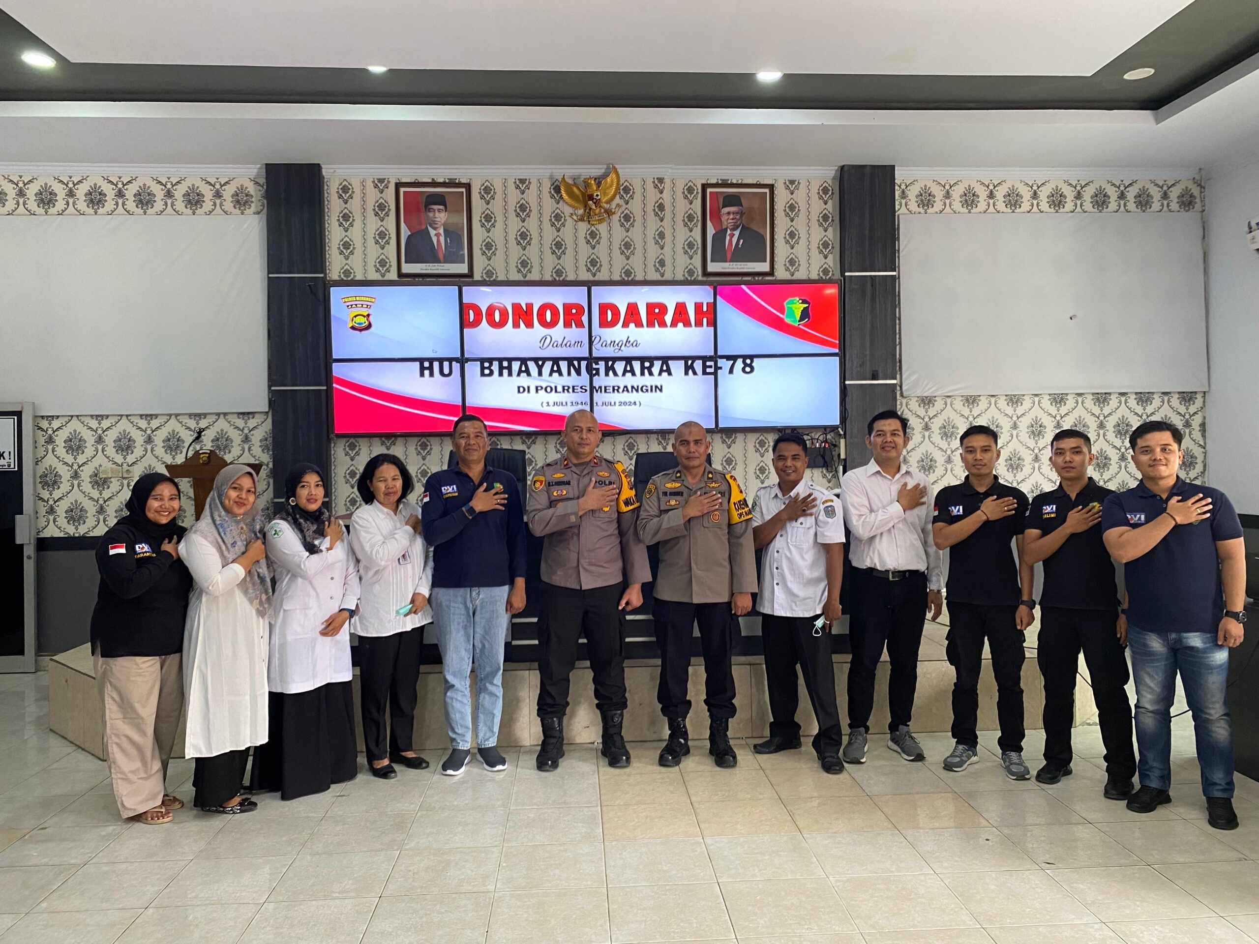 Wakapolres Merangin Kompol Marhara T Siregar Mengatakan “ Bakti Kesehatan donor darah ini merupakan salah satu rangkaian kegiatan dalam menyambut HUT Bhayangkara Ke – 78 , Hut Bhayangkara diperingati setiap tanggal 1 Juli, Kegiatan ini melibatkan Anggota Polres Merangin dan Bhayangkari Cab.Merangin”.