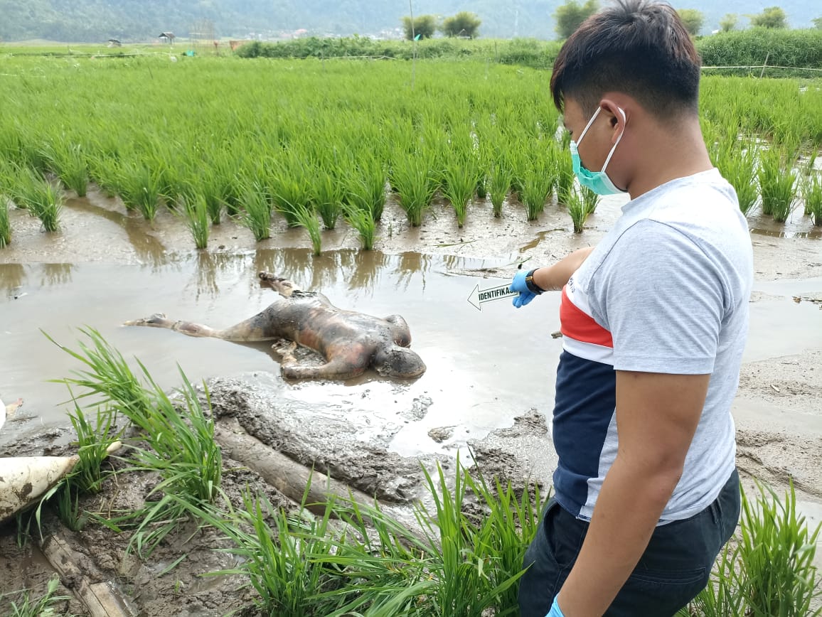 Informasi yang diperoleh sosok mayat ditemukan oleh warga sekira jam 14.30 Wib, dimana mayat ditemukan dalam posisi telungkup di atas lumpur sawah Warga.