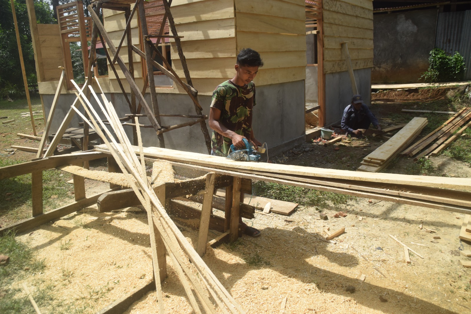 Anggota TNI bersama warga setempat melanjutkan pengerjaan renovasi rumah Supardi, Saat ini pemasangan dinding papan telah mencapai 40%. Masyarakat terlihat antusias saat bekerja sama dengan anggota TNI dalam setiap tahap kegiatan, ini bertujuan untuk menciptakan semangat gotong royong yang menjadi ciri khas bangsa.