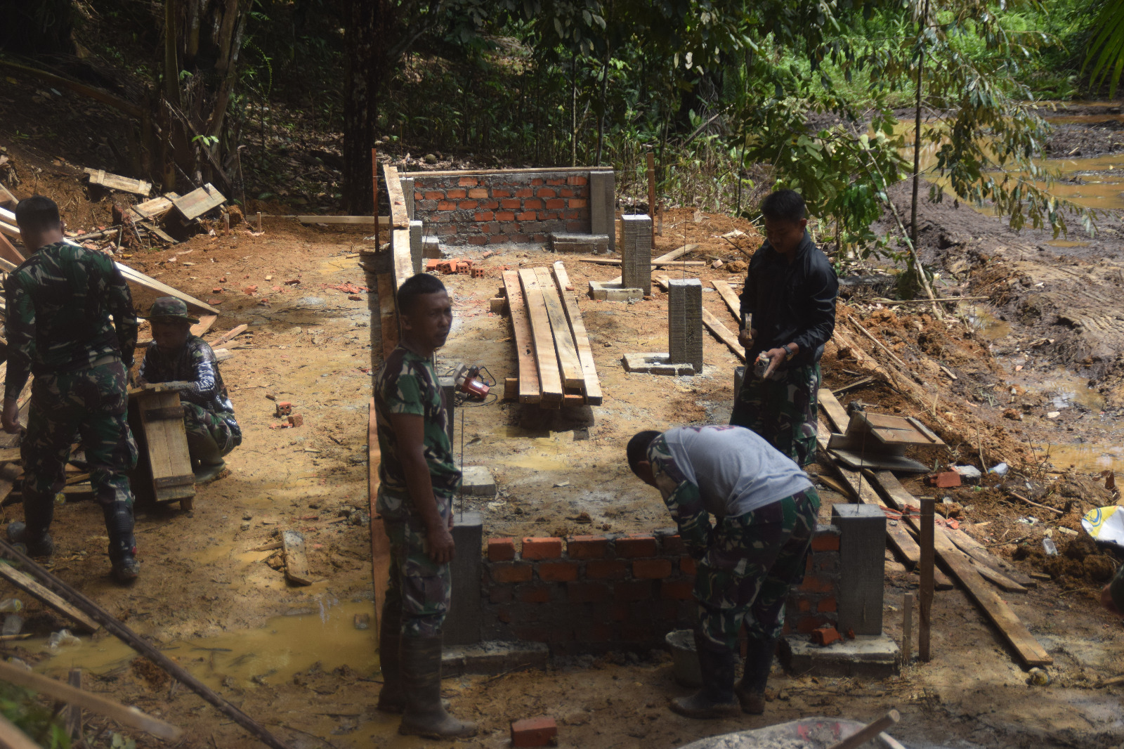 Anggota Satgas TMMD ke 122 Kodim 0420 Sarko terus melaksanakan pembuatan kandang kambing yang kokoh dan bagus, agar nantinya dapat menjadi contoh bagi peternak kambing lainnya.