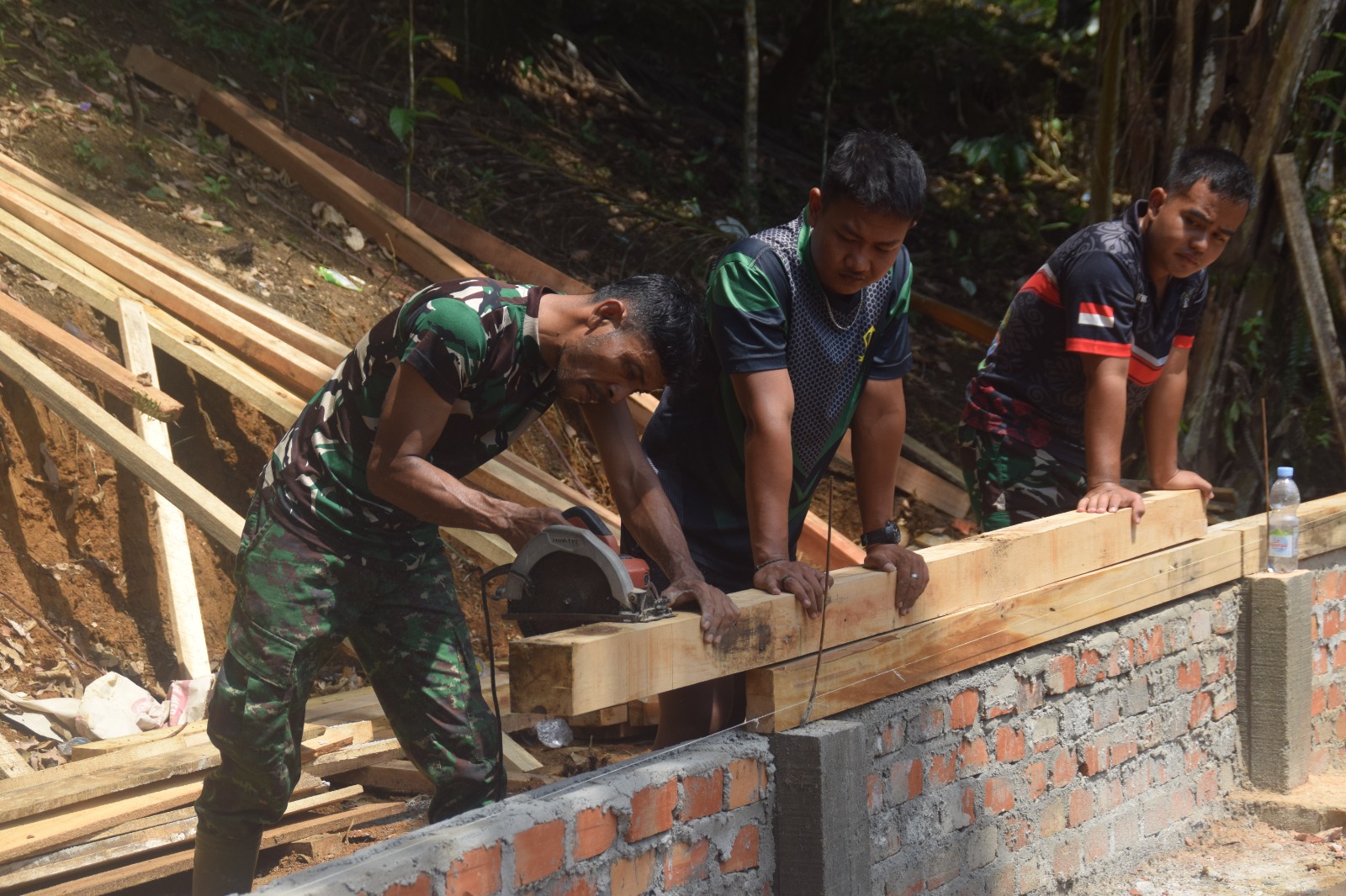 Anggota Satgas TMMD ke 122 Kodim 0420 Sarko melakukan pembuatan kandang kambing yang kokoh dan bagus, agar nantinya dapat menjadi contoh bagi peternak kambing lainnya.