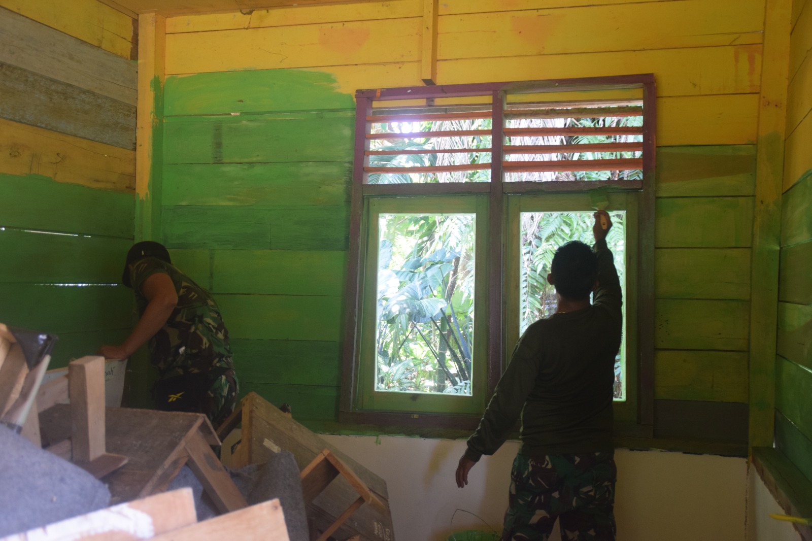 Anggota Satgas TMMD ke 122 Kodim 0420 Sarko dibantu warga saat ini sedang melakukan finishing di sekolah madrasah tersebut.