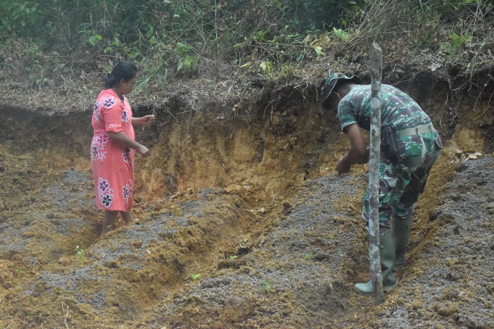 Merangin-Anggota Satgas TNI Manunggal Membangun Desa (TMMD) Serma Syamsul Bahri ikut turun ke lahan pertanian masyarakat Desa Bedeng Rejo (20/10/2024) untuk menanam cabai.
