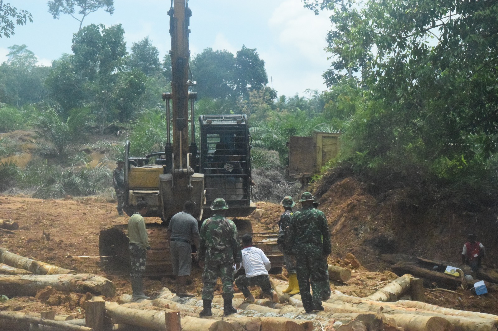 Merangin – Satgas TNI Manunggal Membangun Desa (TMMD) ke 122 Kodim 0420/Sarko, di bawah koordinir Lettu CBA Syafrianto, memulai pengerjaan jembatan darurat dititik ke dua di Desa Bedeng Rejo.