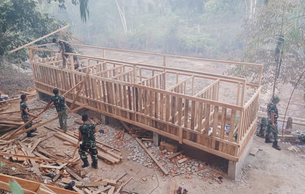 Merangin — Untuk mendukung Program TNI Manunggal Membangun Desa (TMMD) ke-122, anggota Satgas TMMD Kodim 0420/Sarko Sertu Okta memulai melakukan pemasangan tiang kandang kambing yang dibangun di Desa Bedeng Rejo.