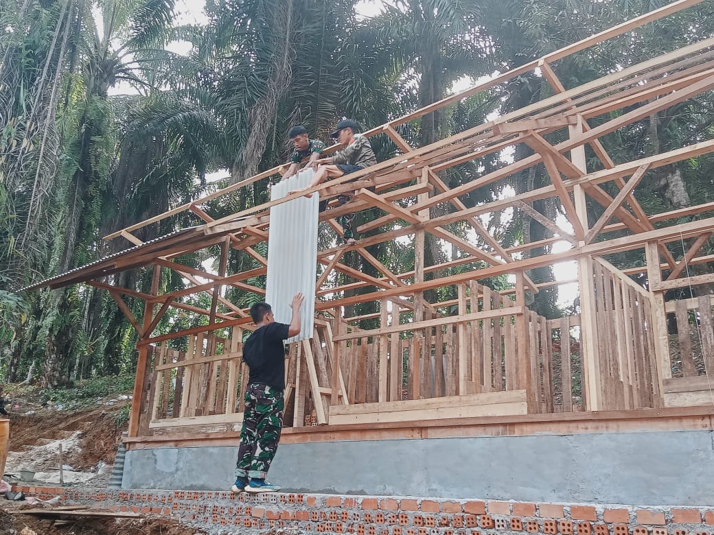 Anggota Satgas TMMD ke 122 Kodim 0420 Sarko hari ini bergotong royong dengan warga setempat melakukan pemasangan atap kandang kambing, agar nantinya ternak kambing tidak terkena hujan dan panas.