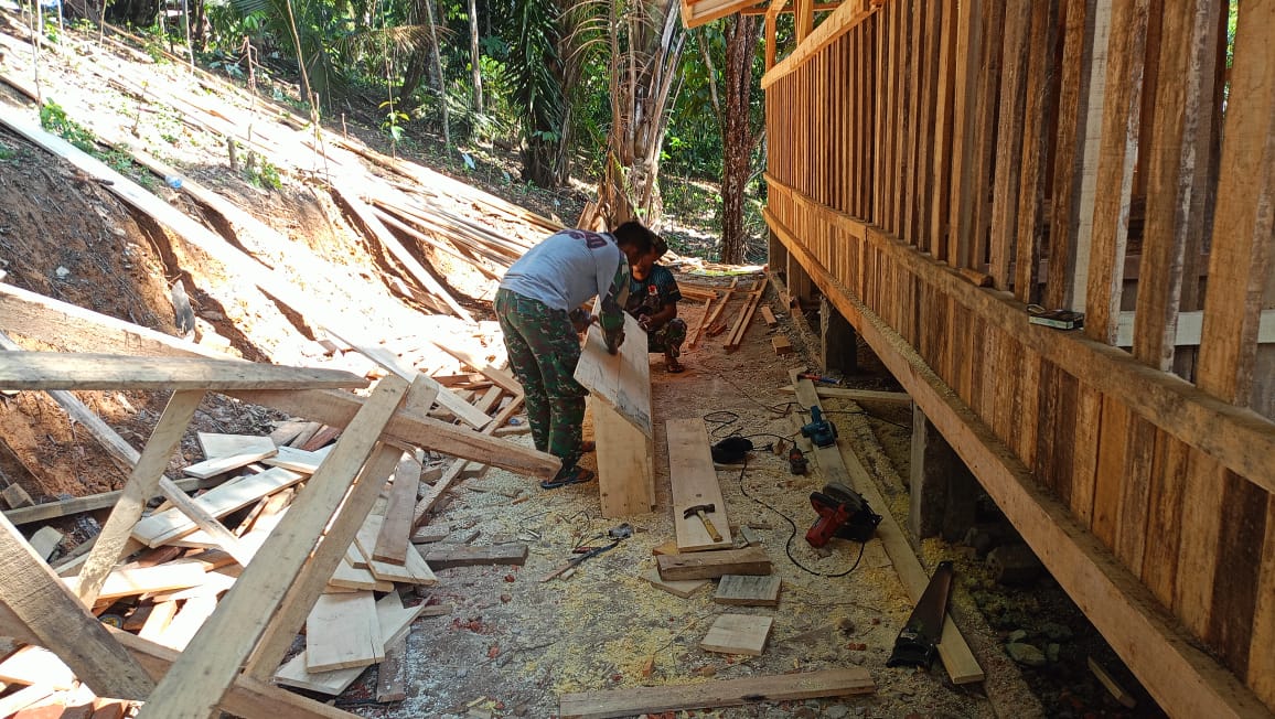 Merangin-Anggota Satgas TMMD Ke-122 Kodim 0420/Sarko, Sertu Okta hari ini Selasa (29/10/2024) melakukan kegiatan pemasangan pintu kandang kambing di Desa Bedeng Rejo. Hal ini dilakukan sebagai upaya meningkatkan kualitas peternakan di desa serta mendukung program ketahanan pangan.