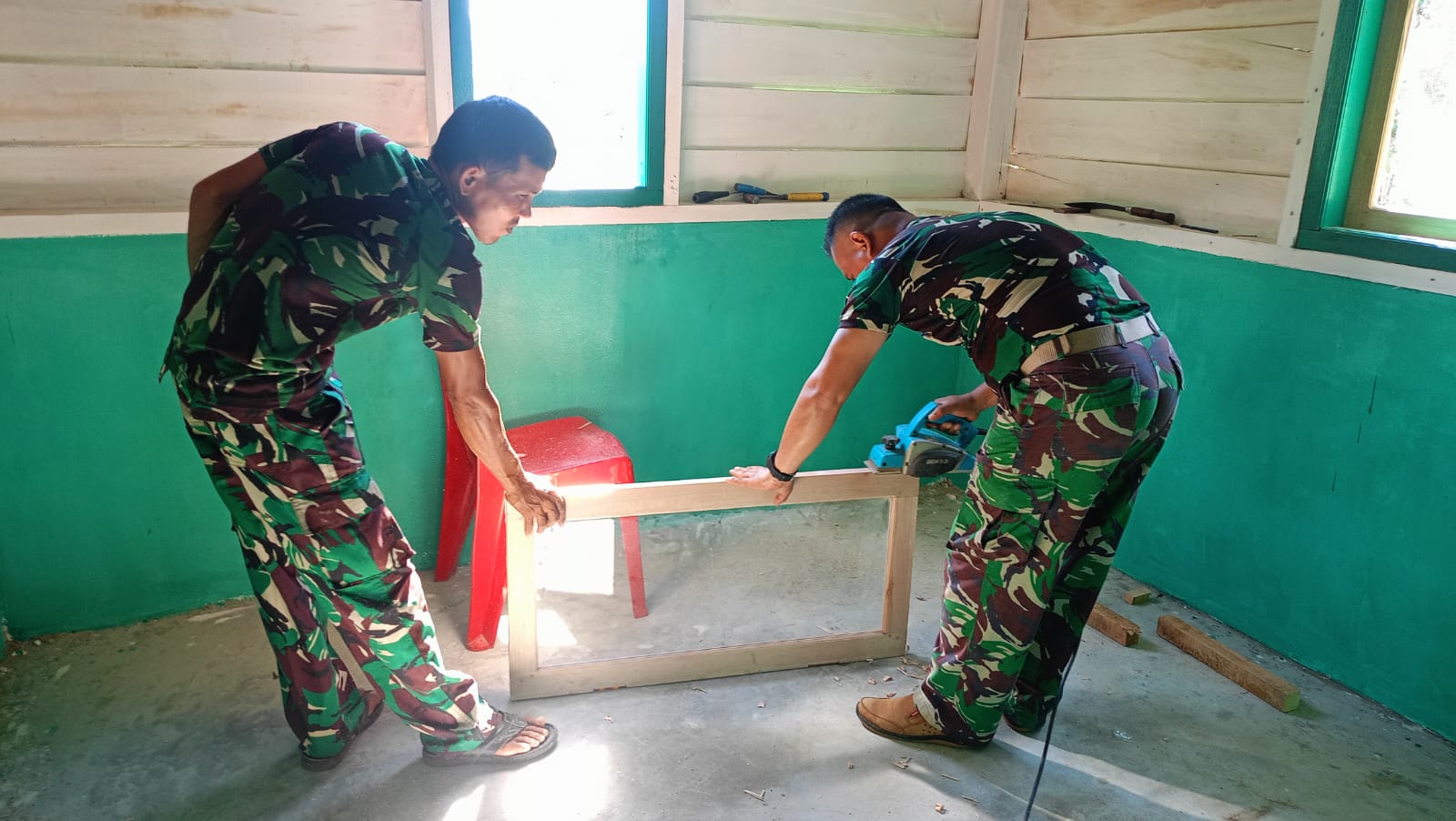 Minggu (27/10/2024) anggota Satgas TMMD ke 122 Kodim 0420 Sarko masih terlihat mengerjakan pekerjaan finishing di rumah Yabani, salah satunya dengan memperbaiki jendela.