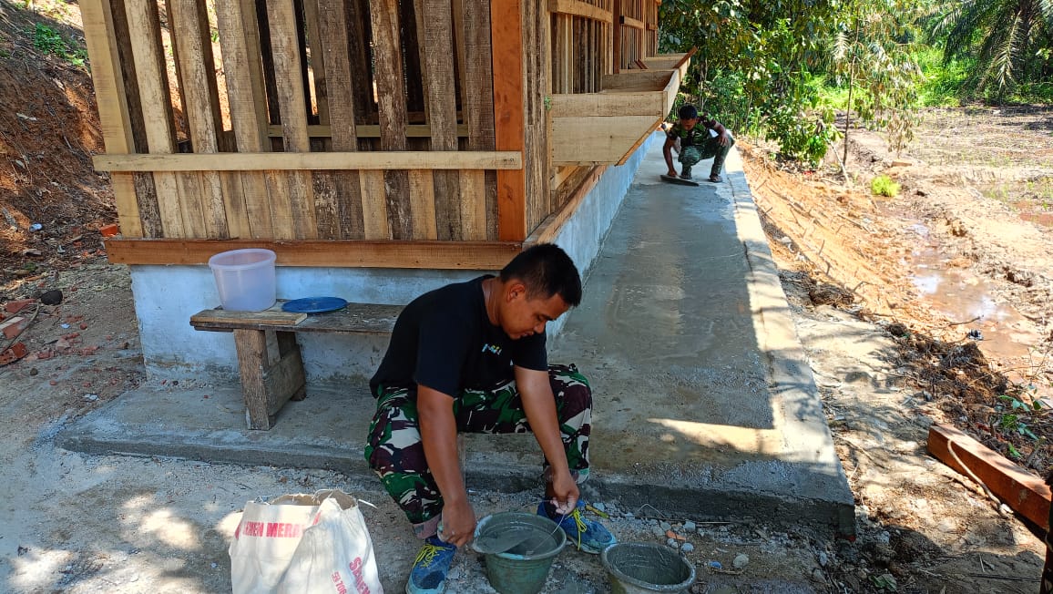 Merangin – Anggota Satgas TNI Manunggal Membangun Desa (TMMD) ke-122 Kodim 0420/Sarko telah selesai melakukan proses pembuatan lantai kandang kambing yang dibangun di Desa Bedeng Rejo, Kecamatan Bangko Barat, Kabupaten Merangin.