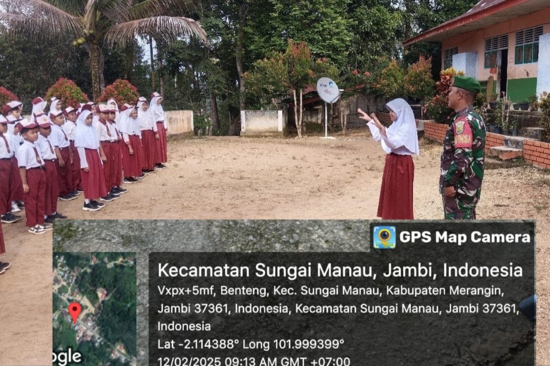 Merangin, Rabu 12 Februari 2025 – Dalam rangka membentuk karakter disiplin dan rasa cinta tanah air sejak usia dini, Babinsa Koramil 420-07/Sei Manau, Kodim 0420/Sarko, Serda Hariyanto melaksanakan kegiatan Komunikasi Sosial (Komsos) melalui program Babinsa Masuk Sekolah di SDN 03/VI Desa Benteng, Kecamatan Sei Manau, Kabupaten Merangin. Program ini bertujuan untuk menanamkan nilai-nilai nasionalisme kepada para siswa-siswi dan memberikan wawasan tentang peran penting TNI dalam menjaga kedaulatan negara.