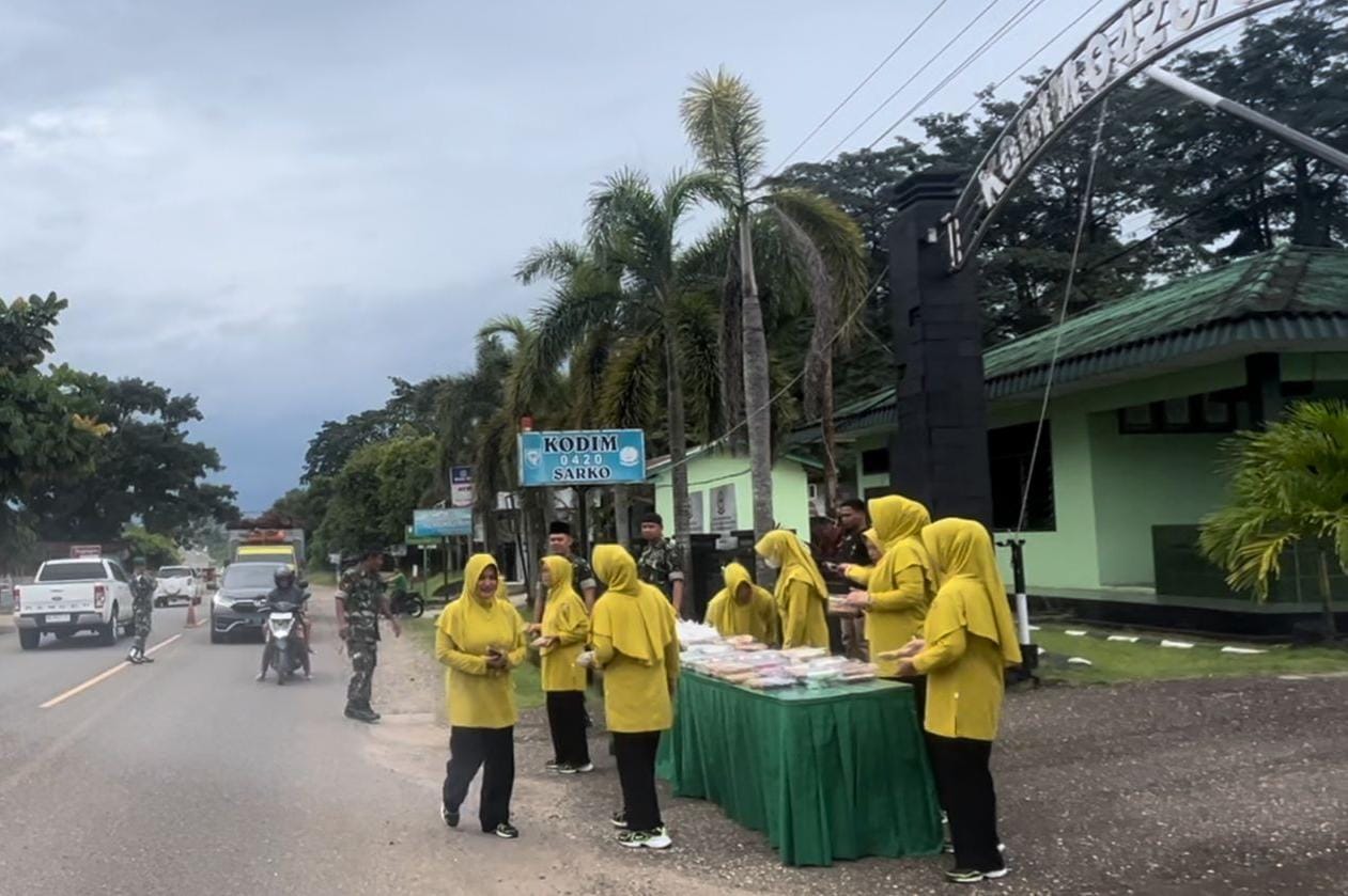 Merangin – Kodim 0420/Sarko menggelar kegiatan sosial yang penuh berkah dengan membagikan takjil gratis kepada warga yang melintas di depan Makodim 0420/Sarko dan masyarakat sekitar. Kegiatan yang dilaksanakan oleh personel staf Kodim 0420/Sarko bersama dengan Persit (Persatuan Istri Tentara) ini bertujuan untuk memeriahkan bulan Ramadhan sekaligus menunjukkan bahwa TNI selalu hadir untuk rakyat, dalam segala situasi. Takjil yang dibagikan terdiri dari bubur dan nasi serta minuman dan berbagai makanan ringan lainnya, yang sangat dibutuhkan oleh umat muslim untuk berbuka puasa.