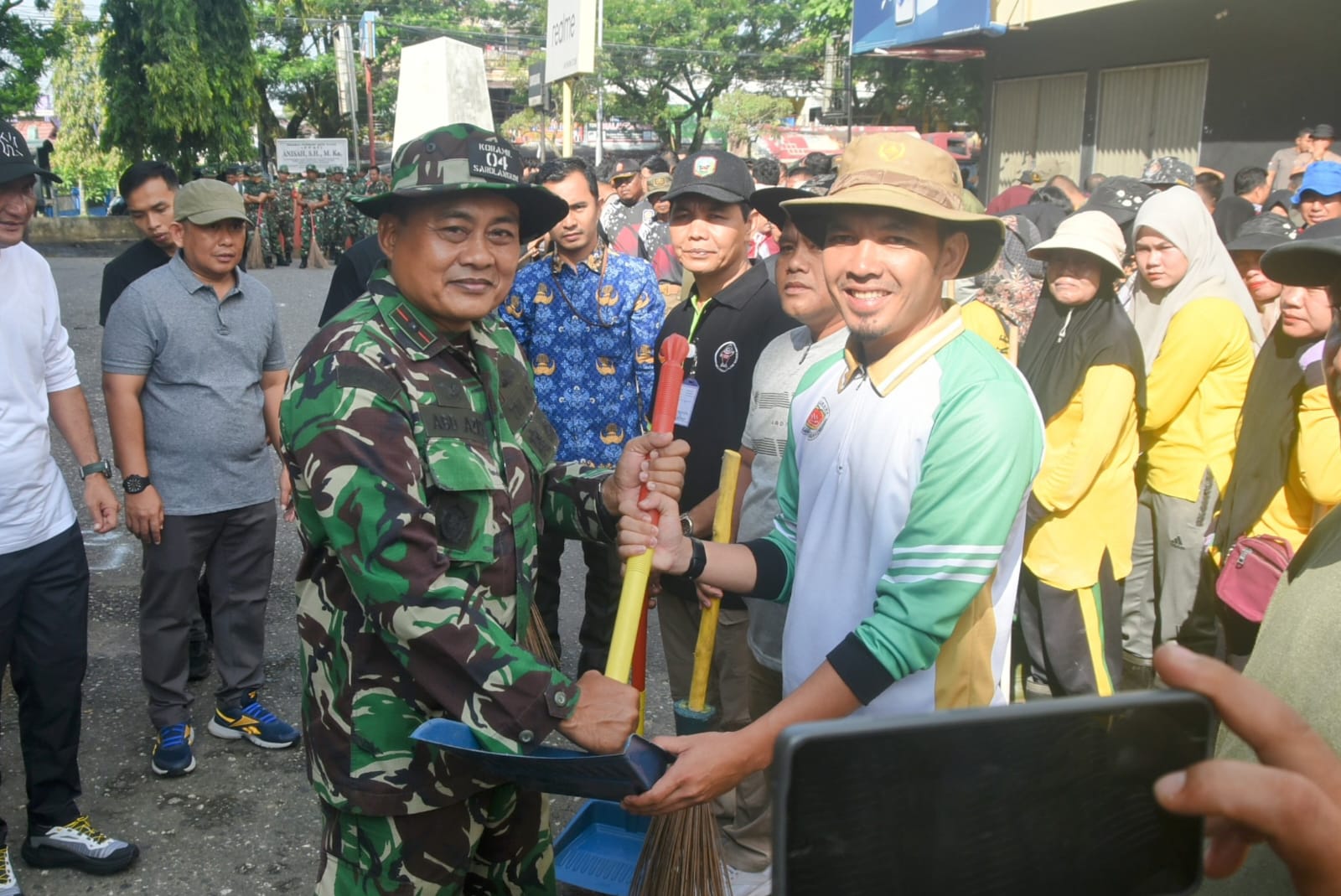 Sarolangun, Jum’at 25 April 2025 Pukul 09.00 Wib – Dalam rangka melaksanakan program 100 hari Bupati Sarolangun, kegiatan Gotong Royong dilaksanakan bertempat di seputaran Hotel Abadi dan sepanjang Jalan Lintas Sumatra, Kota Sarolangun. Kegiatan ini dihadiri oleh berbagai pihak, termasuk Danramil 420-04/Sarolangun, Mayor Inf Abdul Azis Efendy, yang mewakili Dandim 0420/Sarko, Letkol Inf Suyono, S.Sos.