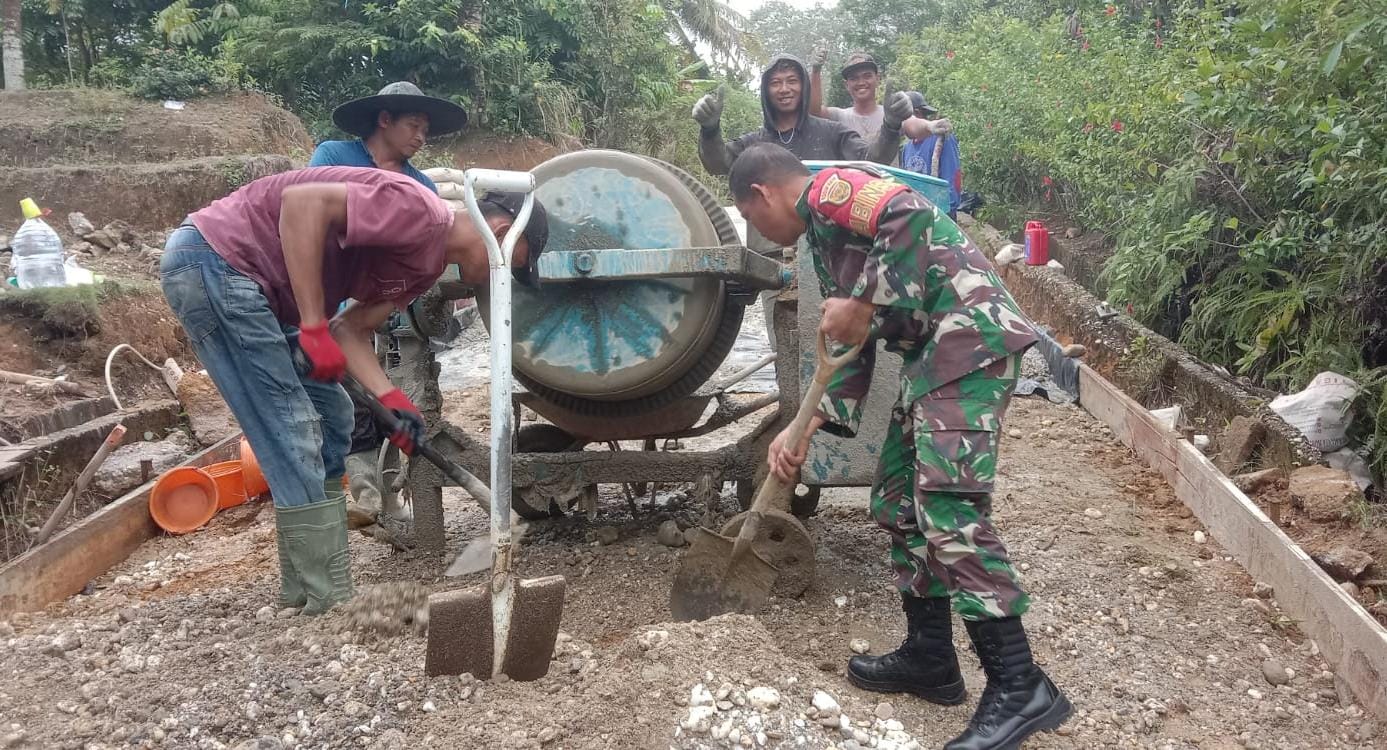 Sarolangun – Wujud kepedulian terhadap pembangunan desa, Babinsa Koramil 420-02/Muara Limun, jajaran Kodim 0420/Sarko Peltu Supriyanto, turun langsung bersama warga dalam kegiatan gotong royong pengecoran jalan di Desa Pelawan, Kecamatan Pelawan, Kabupaten Sarolangun.