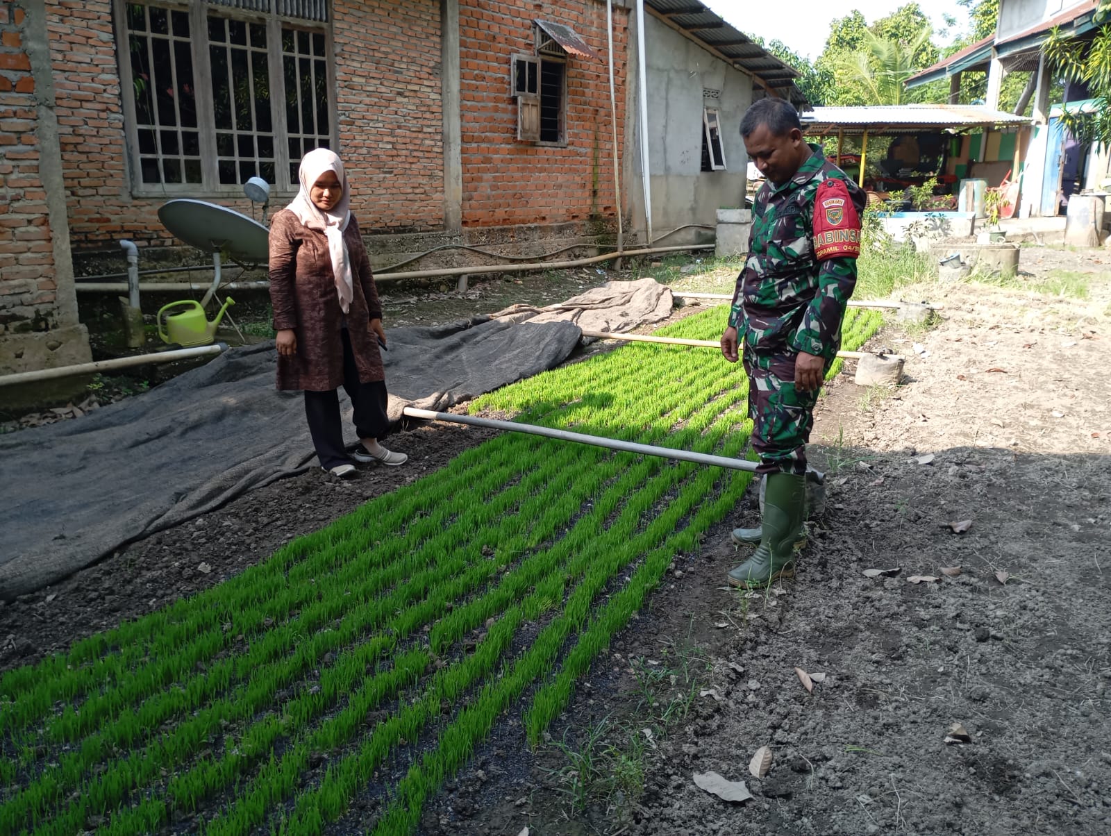Bintara Pembina Desa (Babinsa) Kelurahan Sarolangun Kembang Koramil 420-04/Sarolangun Kodim 0420/Sarko Serda Castam melaksanakan pengecekan penyemaian bibit padi bersama PPL Kelurahan Sarolangun Kembang.(04/06/2025)