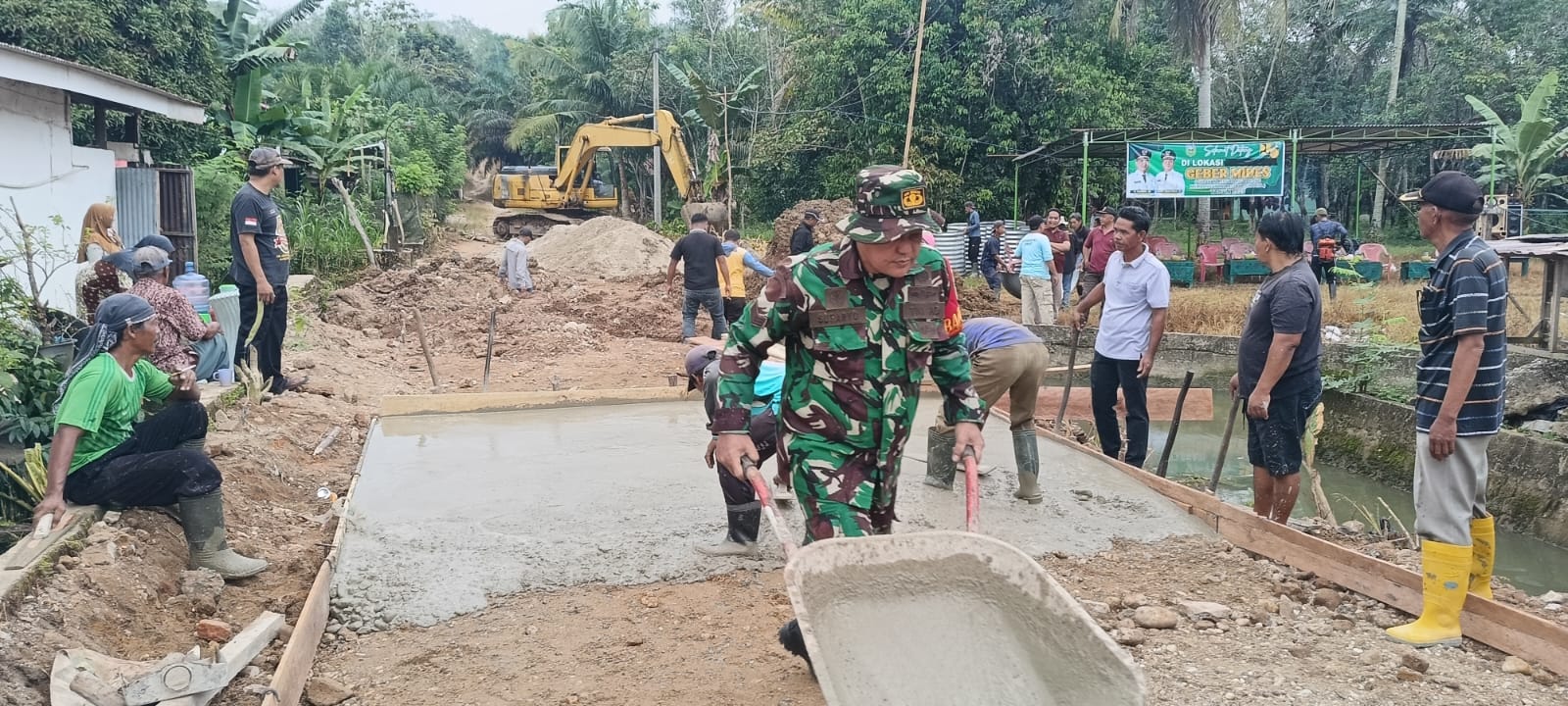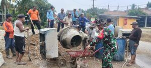 Babinsa Serka Sutaryo anggota Koramil 02/limun Kodim 0420/Sarko Bersama masyarakat binaan melaksanakan Gotong royong pengecoran jalan bertempat di Desa pasar Singkut, Kecamatan Singkut Kabupaten sarolangun Kamis (13-6-2025).