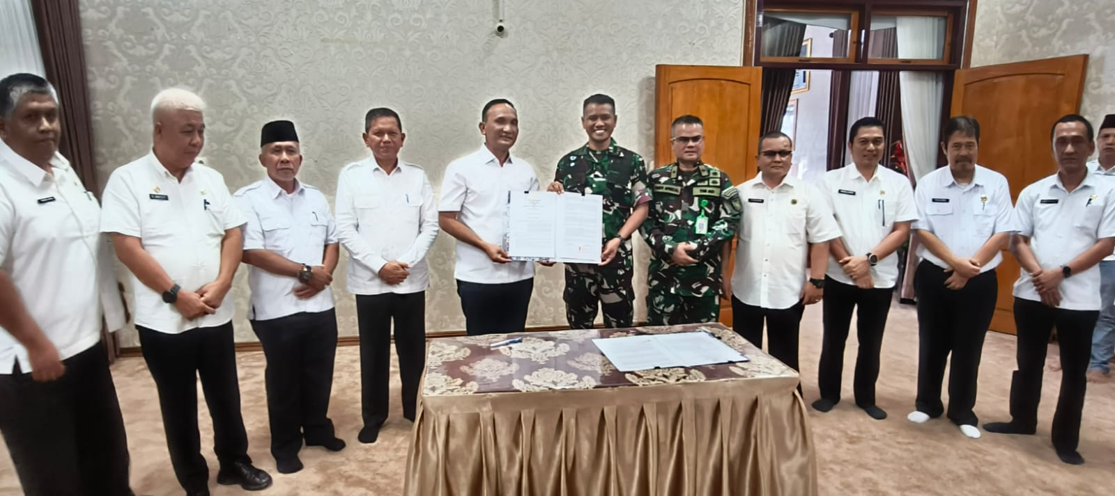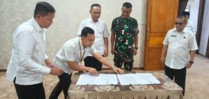 Sarolangun, 18 Juni 2025 — Bertempat di Rumah Dinas Bupati Sarolangun, Rabu sore pukul 16.00 WIB, dilaksanakan acara penandatanganan Nota Kesepahaman (MoU) kerjasama Karyabhakti Swakelola Kodim 0420/Sarko. Penandatanganan tersebut dilakukan langsung oleh Bupati Sarolangun, H. Hurmin, SE bersama Dandim 0420/Sarko Letkol Inf Suyono, S.Sos, sebagai langkah strategis untuk peningkatan infrastruktur jalan desa yang menghubungkan Desa Bathin Pengambang, Desa Tangkuy, dan Desa Sikaladi, Kecamatan Batang Asai.