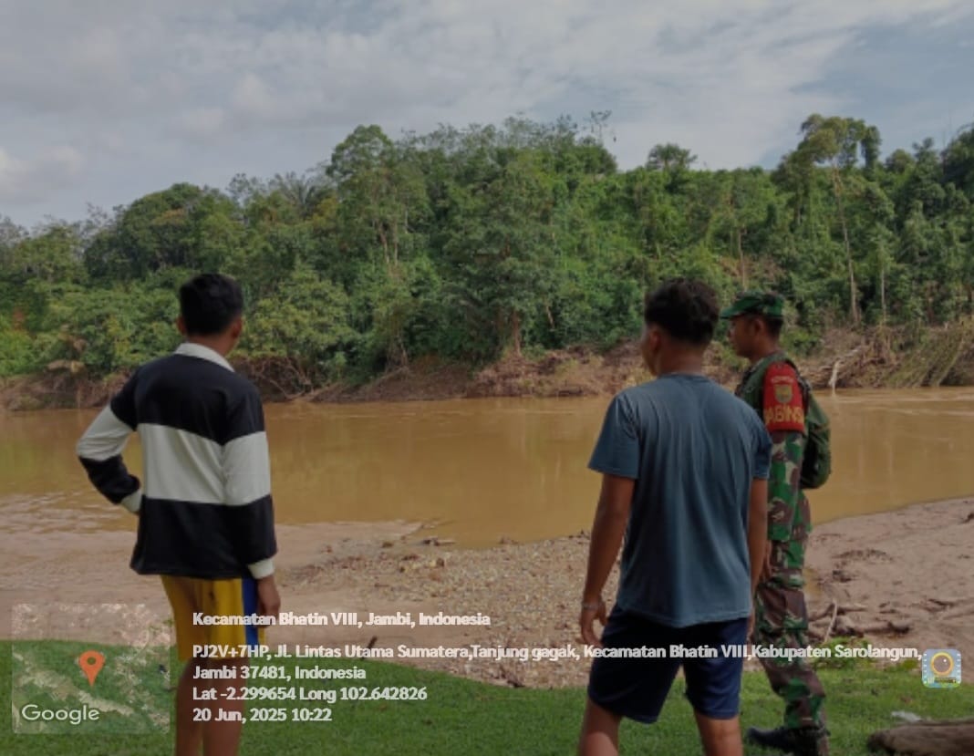 Untuk mengantisipasi adanya bencana Banjir dan tanah longsor. Babinsa Koramil 420-04/Sarolangun Kodim 0420/Sarko Serda Jambari melakukan patroli dan cek debit air di Sungai Batang Tembesi wilayah Desa Tanjung Gagak Kecamatan. Bathin Vlll, Kabupaten Sarolangun.(23/06/2025)