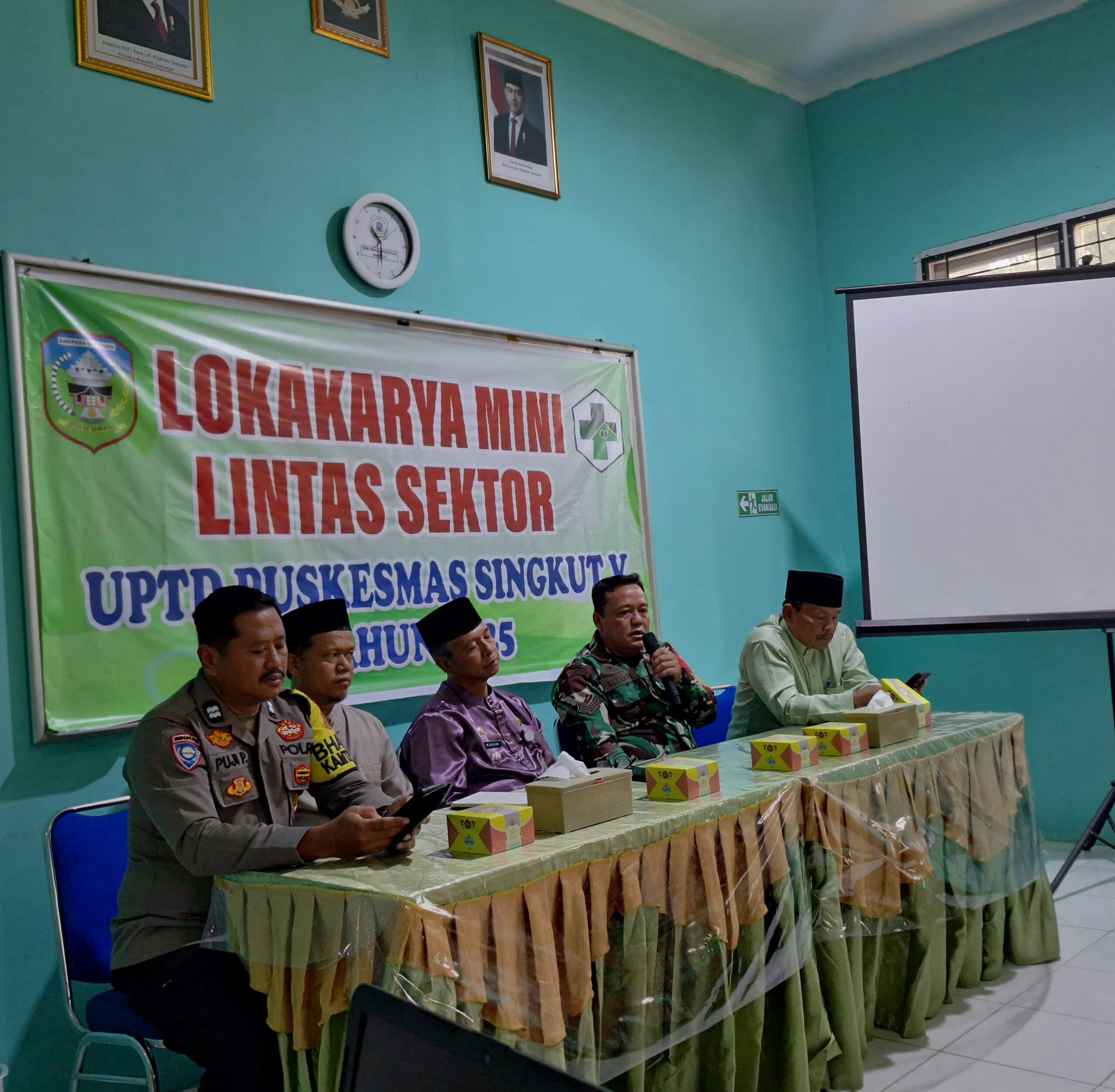 Babinsa Koramil 02/ limun Kodim 0420/Sarko Serka Sutaryo menghadiri undangan lokakarya mini di puskesmas Singkut 5 yang bertempat di Aula UPTD puskesmas , kecamatan Singkut Kabupaten Sarolangun, Kamis (27/06/2025).