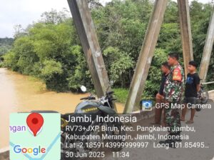 Pangkalan jambu – Untuk mengantisipasi adanya bencana Banjir dan tanah longsor, Babinsa Koramil 420-07/Sungai Manau Kodim 0420/Sarko, Serka Suwarno, melakukan patroli Bansor sekalian cek debit air di Sungai Merangin wilayah Kecamatan Pangkalan jambu , Kabupaten Merangin.(30/06/2025)