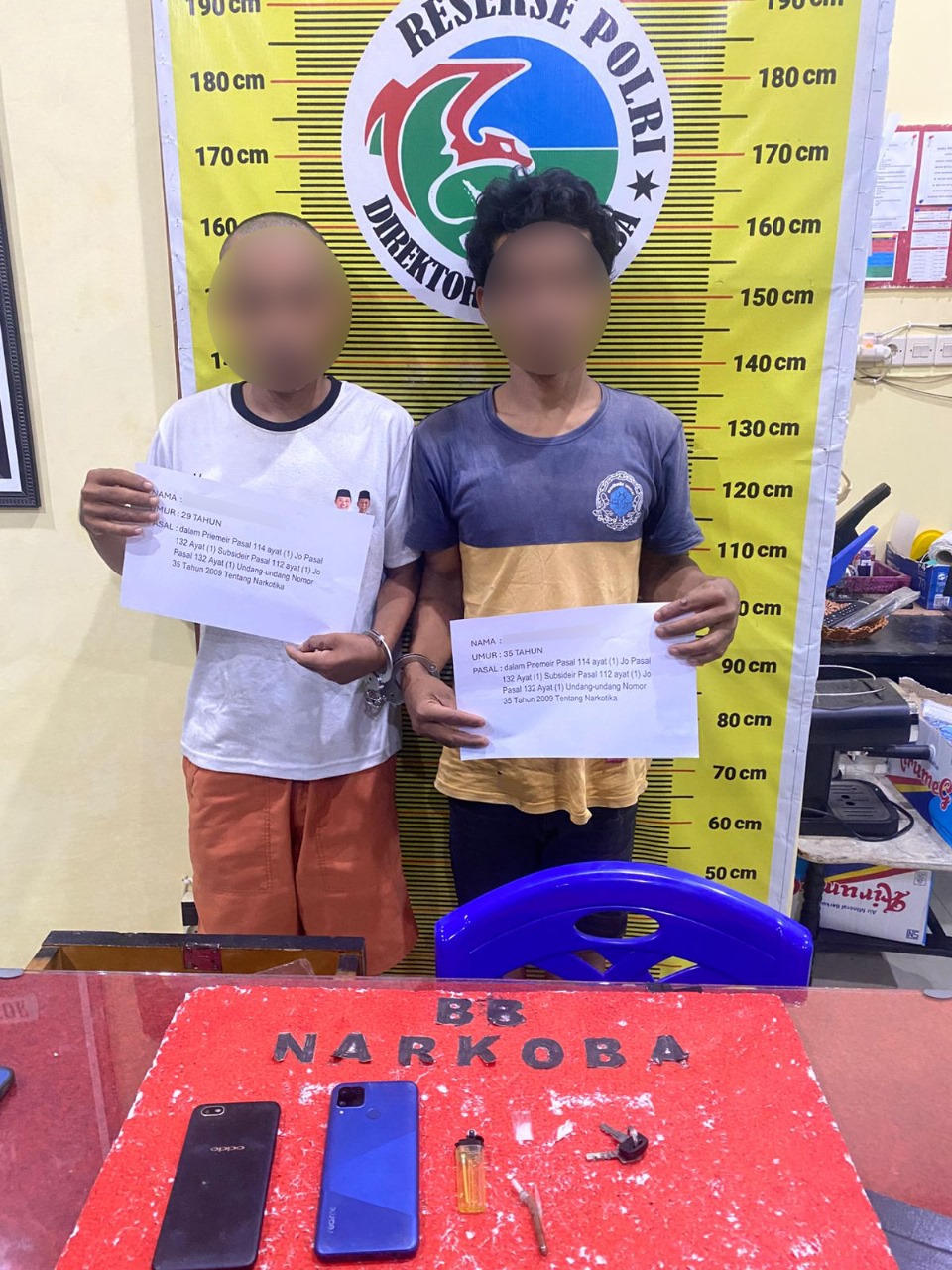 Setelah beberapa hari dilakukan penyelidikan, tepatnya pada hari Kamis (26/06/2025) sekira pukul 22.00 Wib, Tim berhasil meringkus tersangka ES (29) dan tersangka M (35), pada saat dilakukan penggeledahan badan ditemukan barang bukti berupa 1 (satu) buah plastik bening yang diduga berisi narkotika jenis sabu, 1 (satu) unit sepeda motor merek Honda Supra FIT, 1 (satu) unit sepeda motor merek Honda BEAT,1 (satu) unit Hp android merek OPPO, 1 (satu) unit Hp android merek REALME dan 1 (satu) buah kaca pirex.