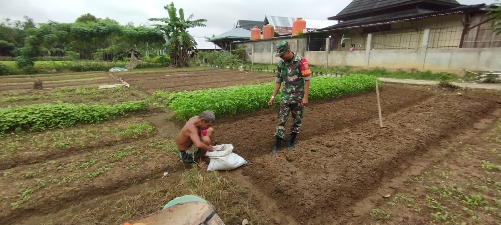 Sarolangun- Dalam melakukan kegiatan pendampingan Hanpangan (ketahanan pangan) terhadap petani di wilayah binaannya Serka Deni Riadi selaku Babinsa Desa Pulau Melako Kec, Bathin VIII Kab, Sarolangun membantu Petani merawat tanaman sayuran berupa kangkung, dan sawi, di lahan seluas 0,2 Ha milik bpk Hanip 63 th.(14/07/2025)