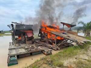 Kegiatan ini melibatkan berbagai unsur, termasuk Kodim 0416/Bute, Satpol PP Kabupaten Bungo ini membakar puluhan peralatan tambang ilegal.
