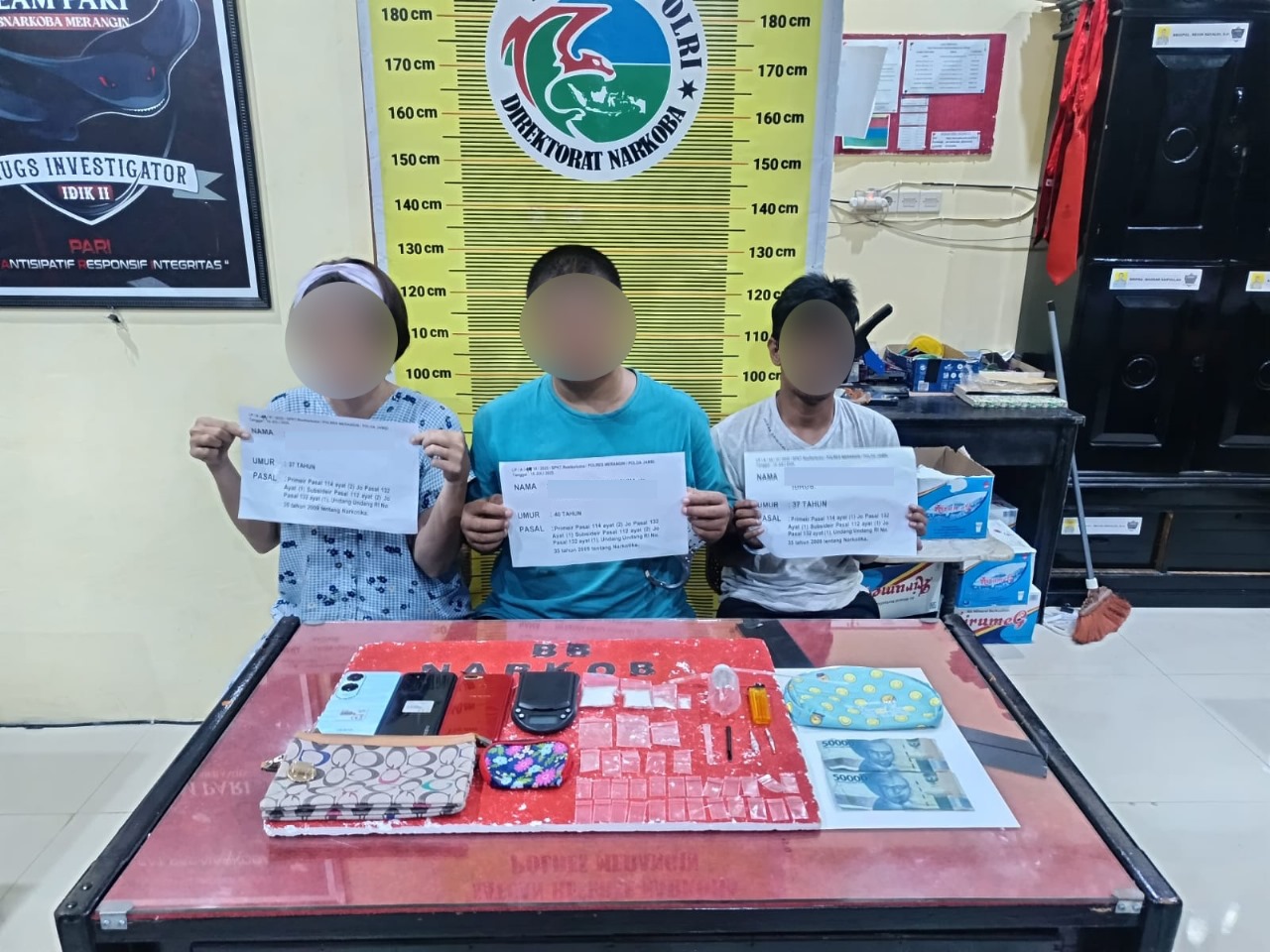 Pada saat dilakukan penangkapan polisi berhasil mengamankan 3 orang tersangka masing-masing berinisial TDAK alias ANGGA (40), bersama istrinya APS (37) dan N Alias BUYUNG (37) dan pada saat dilakukan penggeledahan dirumah tersangka, polisi mengamankan barang bukti berupa 4 (empat) paket yang diduga berisi narkotika jenis sabu dengan berat bruto 16,91 gram, beserta barang bukti lainnya yang ada kaitannya dengan tindak pidana penyalahgunaan narkotika jenis sabu.