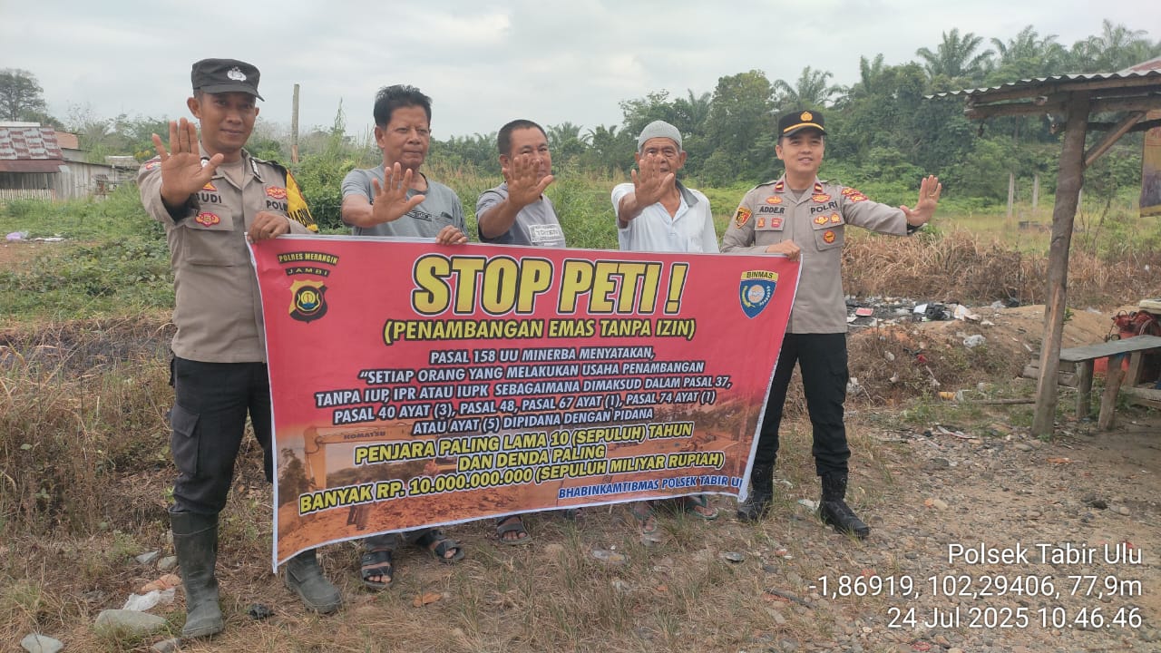 Merangin – Dalam rangka mencegah dan menekan kegiatan penambangan emas tanpa izin (PETI) di wilayah hukum Polsek Tabir Ulu, personel Polsek Tabir Ulu bersama perangkat Desa Medan Baru melakukan pemasangan spanduk himbauan larangan PETI, Kamis (24/7/25).
