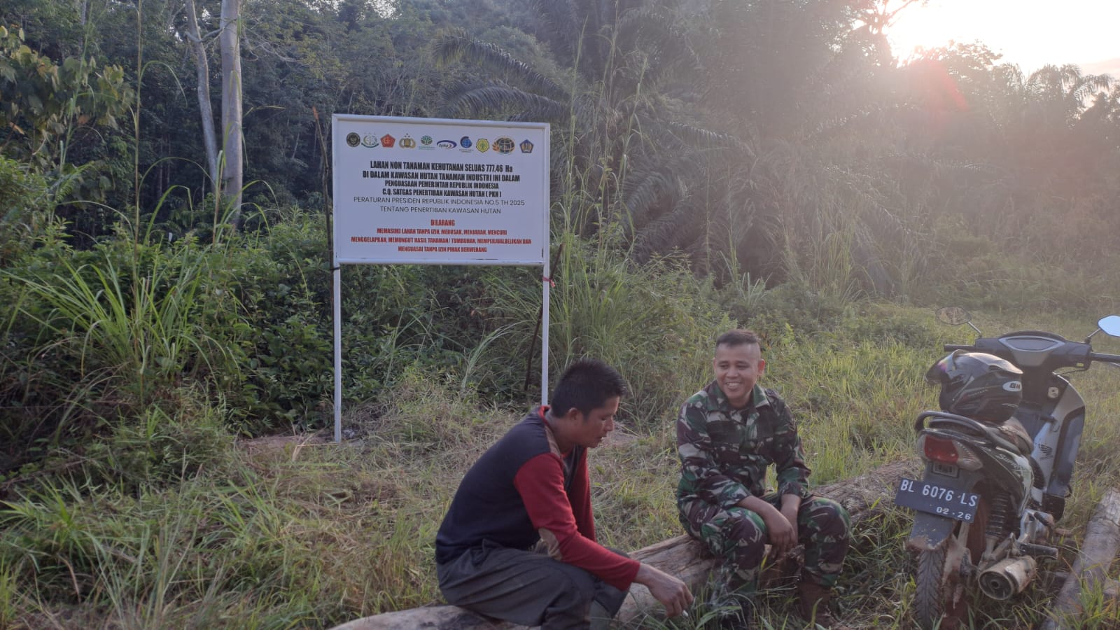 Personil Babinsa Koramil 09 Bangko Kodim 0420 Sarko melakukan pengecekan terhadap plang milik Satuan Tugas Garuda Penertiban Kawasan Hutan (SATGAS PKH) di Desa Nalo Gedang Kec Nalo Tantan Kab Merangin.(07/08/2025)