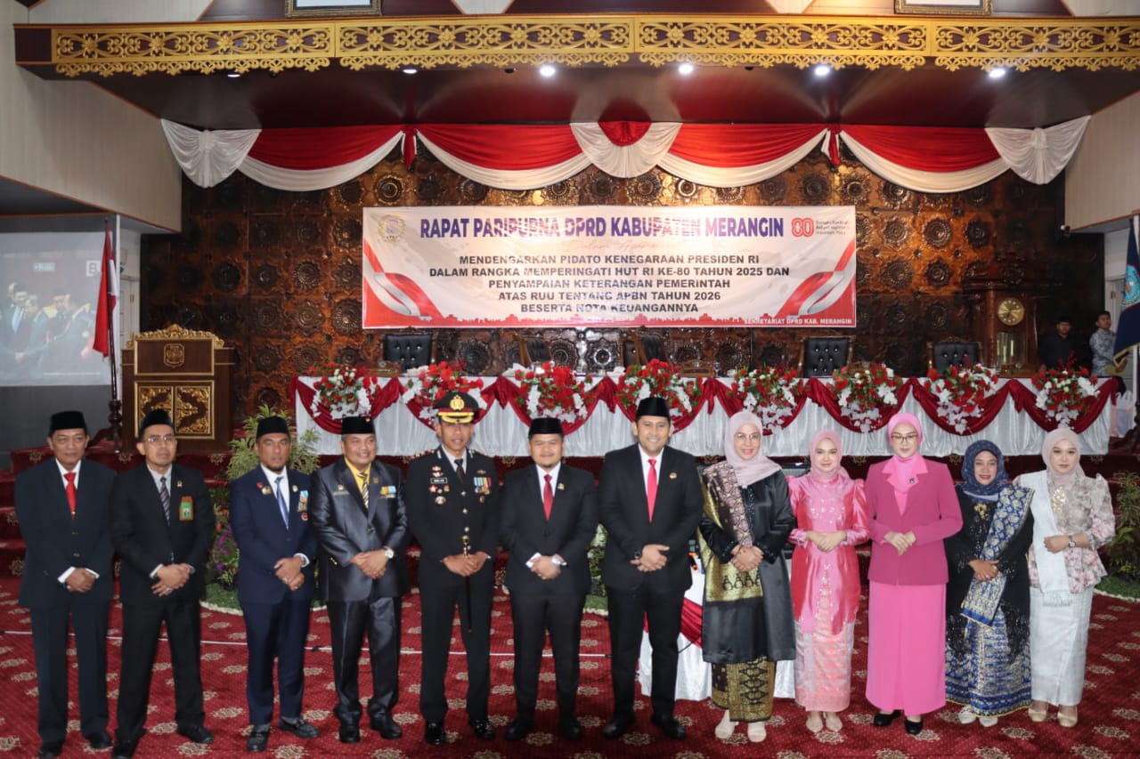 Merangin – Jambi. Kapolres Merangin AKBP Kiki Firmansyah Efendi, S.I.K, MH., didampingi Ibu Ketua Bhayangkari Cabang Merangin mendengarkan Pidato Kenegaraan Presiden Republik Indonesia Prabowo Subianto pada Sidang Tahunan Majelis Pemusyawaratan Rakyat (MPR) RI dalam rangka peringatan Hari Ulang Tahun (HUT) ke-80 Kemerdekaan RI Tahun 2025 digedung DPRD Kab. Merangin, Jumat (15/08/2025).