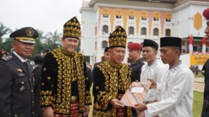 Tampil sebagai Inspektur upacara Bupati Merangin H M Syukur, sekaligus membacakan teks Pancasila, yang diikut seluruh peserta upacara yang hari itu kompak mengenakan Baju Teluk Belango bagi laki-laki dan Baju Kurung bagi perempuan.