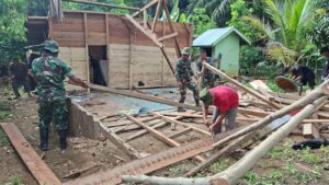 Suasana pagi penuh semangat gotong royong. TNI dan masyarakat bahu membahu mengangkat dan merobohkan bagian-bagian rumah yang lama guna tahap awal dari pembangunan yang baru. Meski kondisi cuaca cukup panas, hal tersebut tidak menyurutkan semangat para personel dan warga dalam menyukseskan kegiatan sosial ini.