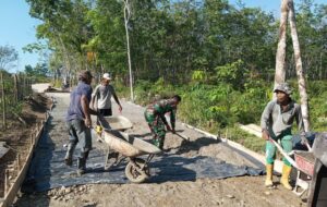 Tanpa ragu, Koptu Raden memegang cangkul, mengaduk dan meratakan campuran material bersama warga. Ia menyatu dalam suasana kerja bakti yang penuh semangat kebersamaan.