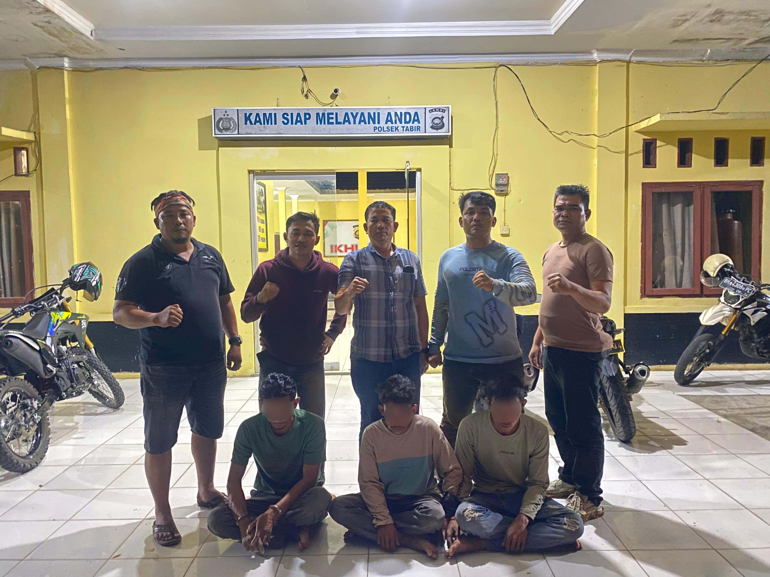 Dari hasil penyelidikan dan tindakan cepat Unit Reskrim Polsek Tabir, Polisi berhasil mengamankan 3 orang tersangka masing-masing berinisial H (21), warga Desa Beluran Panjang Kec. Tabir Kab. Merangin, M (24) warga Desa Beluran Panjang Kec. Tabir Kab. Merangin dan HM (41) warga Desa Kota Raja Kec. Tabir Ilir Kab. Merangin. Sementara dua orang pelaku lainnya berhasil melarikan diri dan masih dalam proses pengejaran.